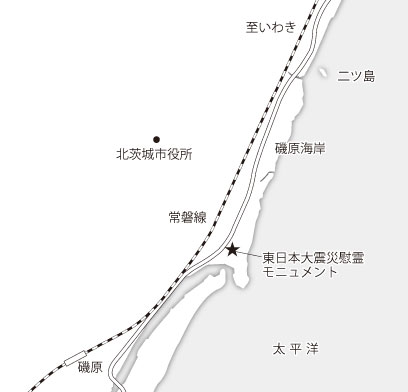 石碑:JR常磐線磯原駅から約1㌔、二ツ島:同約2・1㌔