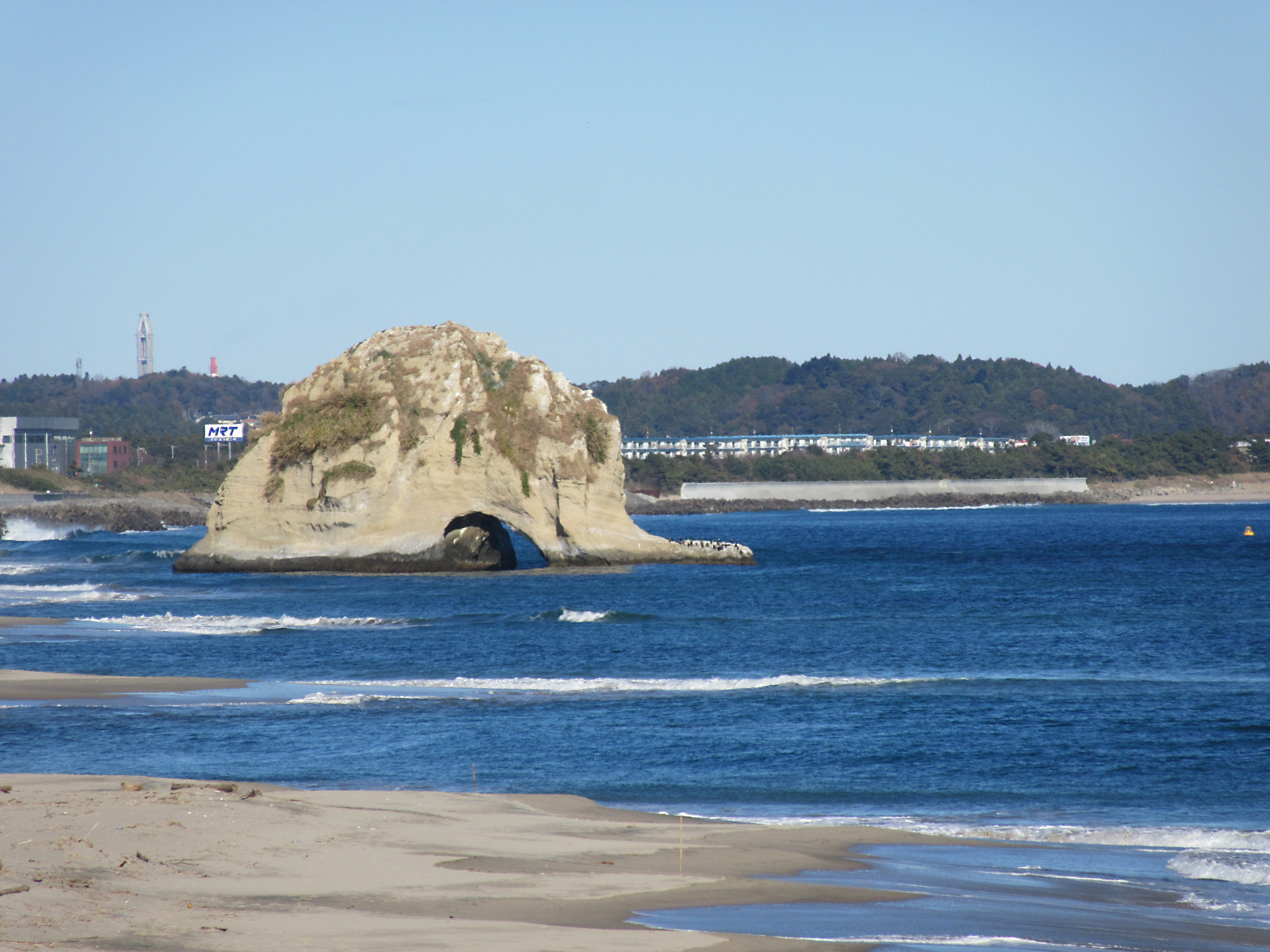 磯原には雨情の生誕地のほかに、もう一つ、観光のシンボルともいえる名所がある。二ツ島と呼ばれる。茨城百景にも選ばれ、干潮時に島に触れると三つの願いごとの一つがかなうと伝わる神秘の島だ。だが、巨大な津波は願いごとを奪うかのようにこの島に迫った。