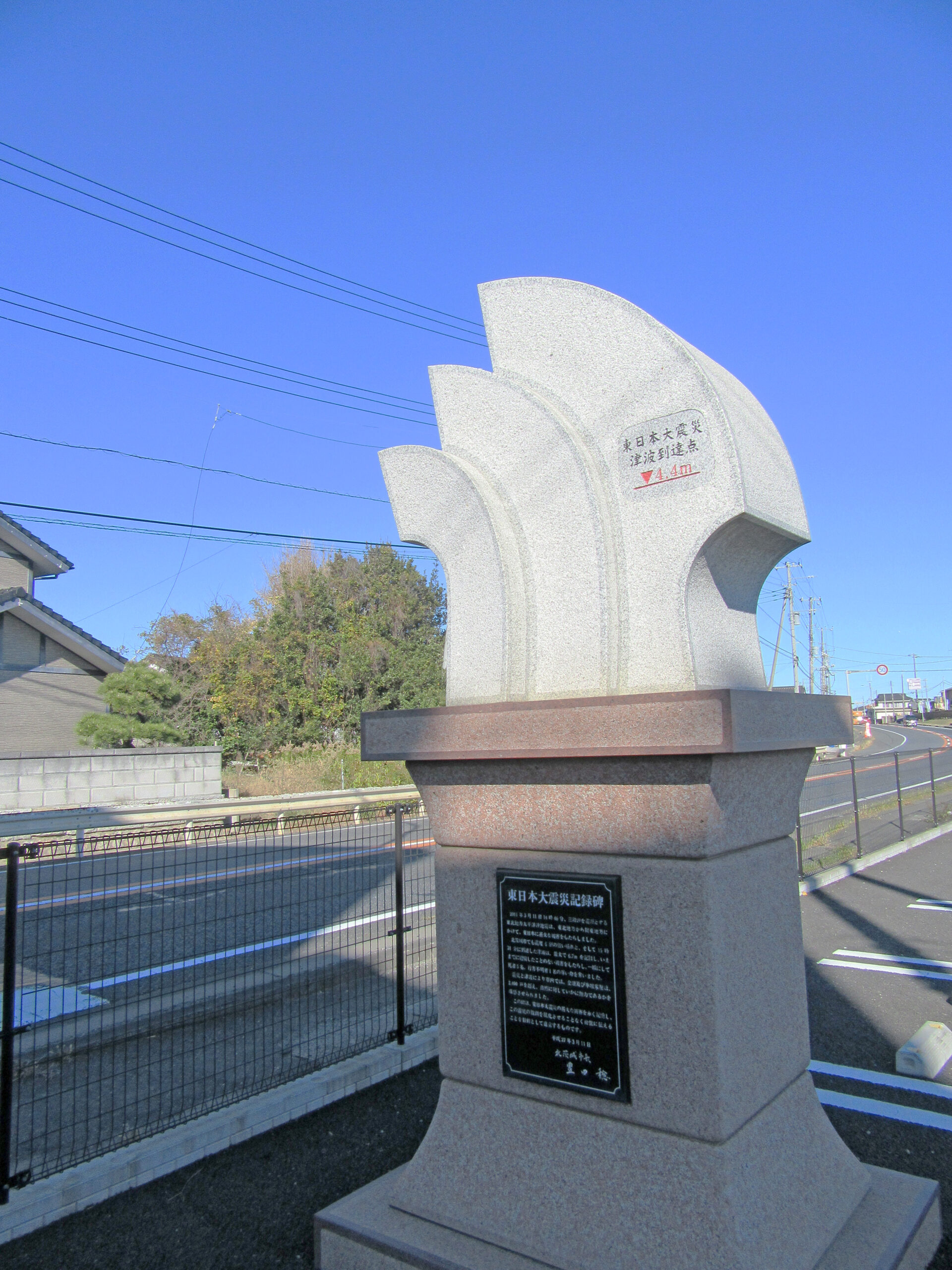 この二ツ島からほど近い磯原海岸広場内に東日本大震災慰霊モニュメントが完成したのは、地震からちょうど4年目にあたる平成27(2015)年3月11日のことだ。津波をイメージした碑はこの地を襲った津波の高さ4・4㍍の位置が朱入れされている。碑文は「津波は最大で6・7㍍を記録し、今までに経験したことのない被害をもたらし、一瞬にして死者5名、行方不明者1名の尊い命を奪いました。震災と津波により市内では全壊および半壊家屋は2400戸を超え、自然に対していかに無力であるかを痛感させられました」と記し、震災の教訓を風化させることなく後世へ伝えていく役目を果たすと強調する。